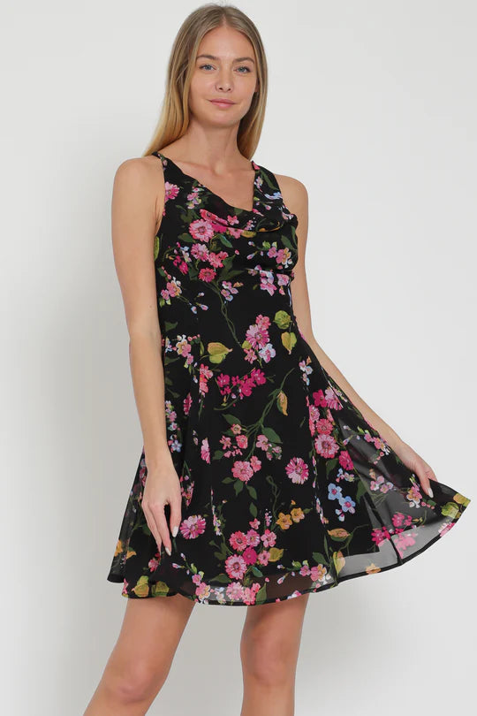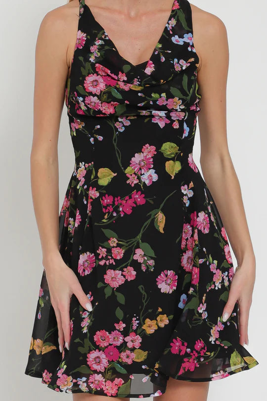 Get ready to turn heads with the Aakaa Cowl Sleeveless Across Back Strap Mini Dress! This playful dress features a cowl neck and a sleeveless design with a unique cross strap back. Stand out from the crowd with the eye-catching pink and black floral pattern. Perfect for any occasion!