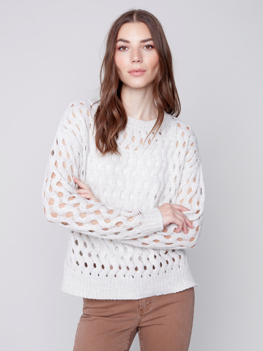 Ce pull en peluche en tricot torsadé à col rond et point ouvert Charlie B est parfait pour toutes les saisons. Fabriqué à partir de tissu tricoté torsadé de qualité supérieure, ce pull présente un design à mailles ouvertes et une sensation luxueuse et moelleuse. Le design à col rond est élégant et ultra confortable. Profitez d'un style cosy toute l'année avec cette pièce intemporelle.