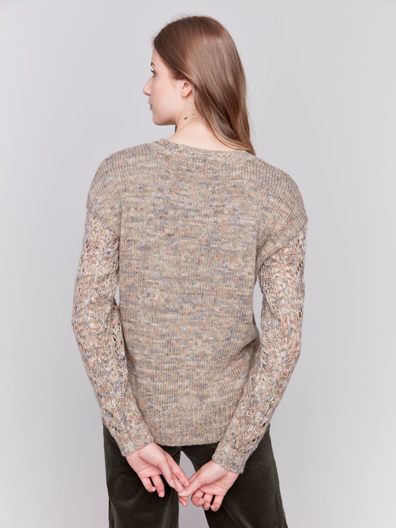 Make a statement with the Charlie B Fishnet Sleeve Crew Neck Sweater. The fishnet sleeves add a trendy, edgy element to the classic crew neck design. Crafted from a soft knit fabric, this sweater offers both comfort and standout style, ideal for adding a bit of flair to any outfit.