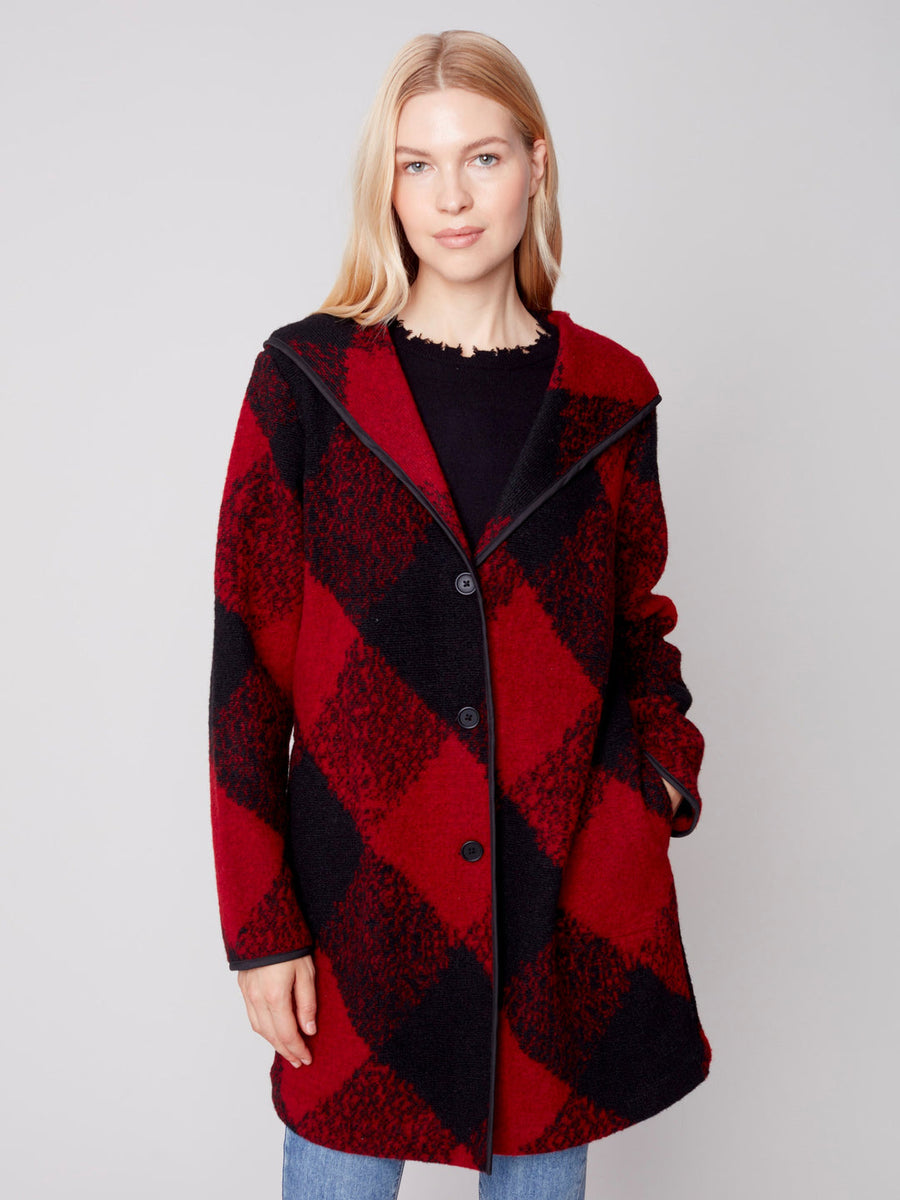 Restez au chaud et élégant avec la veste en laine bouillie boutonnée sur le devant Charlie B. La laine bouillie vous garde au chaud sans vous sentir encombrant, et la capuche offre une couverture supplémentaire lorsque la température baisse. Le look est fini avec des boutons métalliques personnalisés pour une touche de sophistication supplémentaire.
