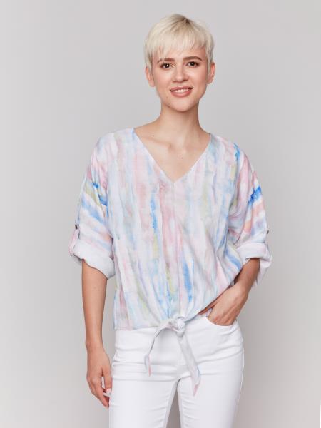 Experience ultimate comfort and style with the Charlie B Printed Dolman top. Its 3/4 roll-up sleeves and front tie add a touch of elegance to any outfit. Stay stylish and comfortable all day long!