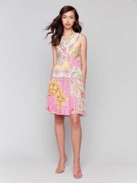 Upgrade your wardrobe with the Charlie B Printed Sleeveless V-Neck Dress with Tiers. This dress boasts a flattering v-neckline and tiered design, making it perfect for any occasion. Its breathable fabric ensures comfort while the bold print adds a touch of fun to your outfit. Elevate your style and confidence with this must-have dress!