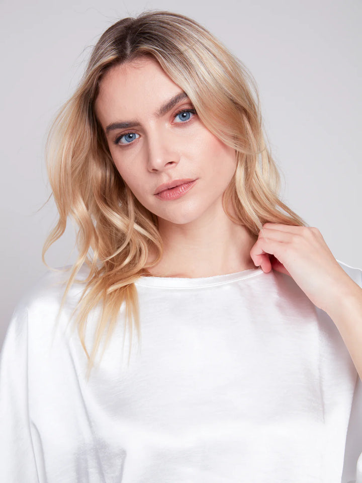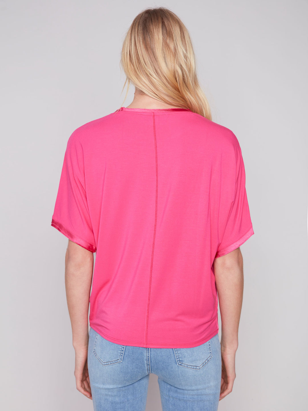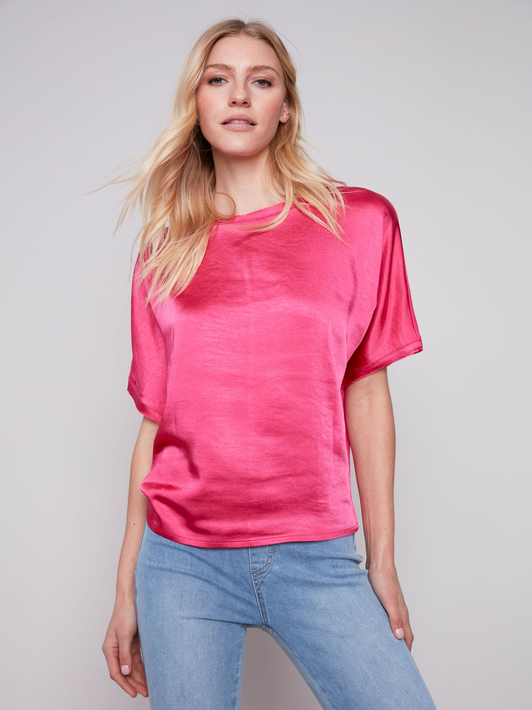 Expertly designed with comfort in mind, the Charlie B Short Sleeves Crew Neck Satin Jersey Knit offers a luxurious feel and a flattering fit. Crafted with high quality materials, this shirt is perfect for any occasion. Elevate your wardrobe with this versatile and stylish piece.