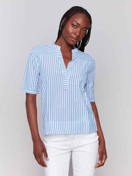 Add a pop of color to your wardrobe with the Charlie B Yam Dye Popover Short Sleeve Blouse. Featuring a unique dye pattern and convenient popover style, this blouse is perfect for any occasion. Feel confident and stylish all day long!