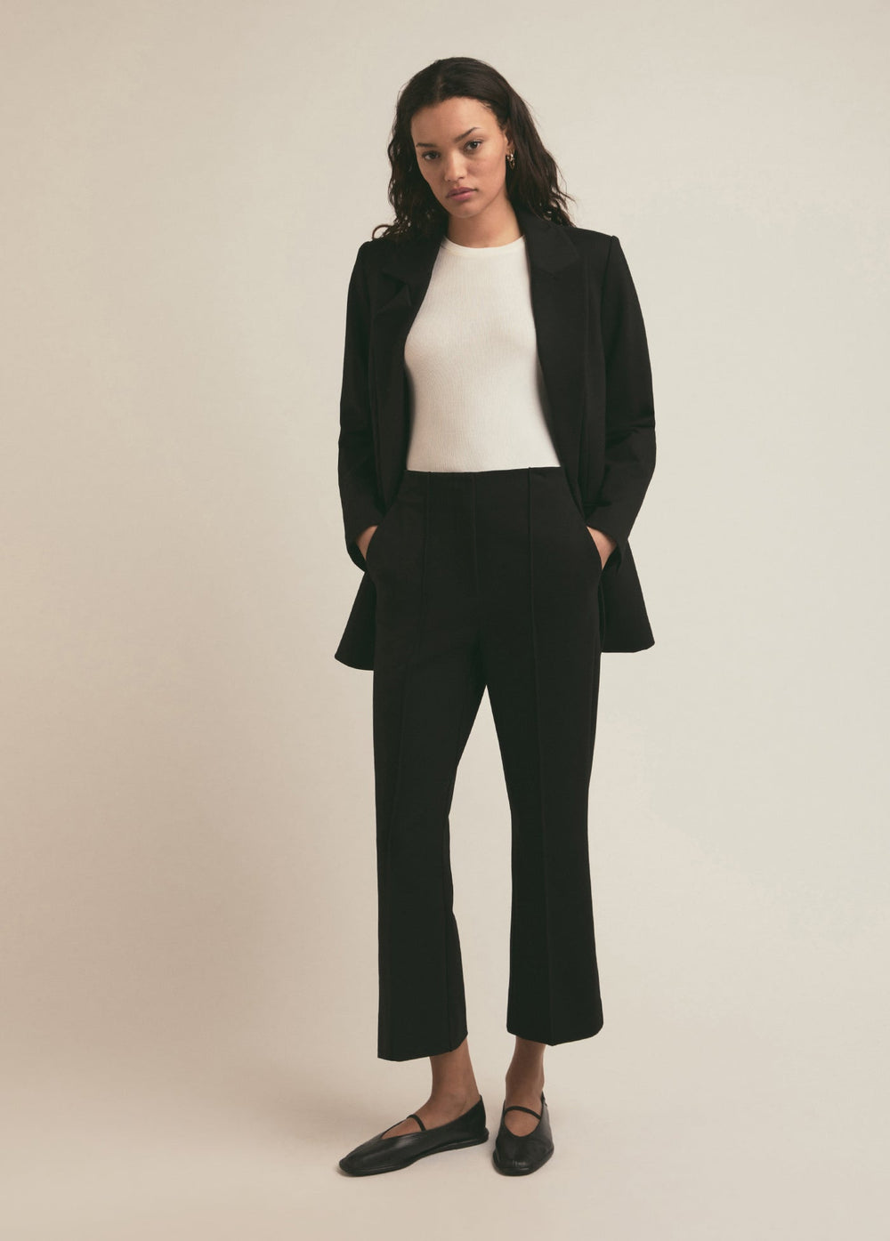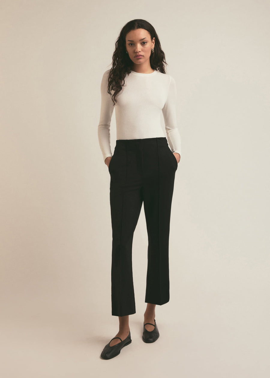 A slim-yet-structured fit, the pants are finished with back welt pockets, a front zipper and a clean, tailored waistband With a cropped kick flare and pintuck front detail. 26.5" inseam