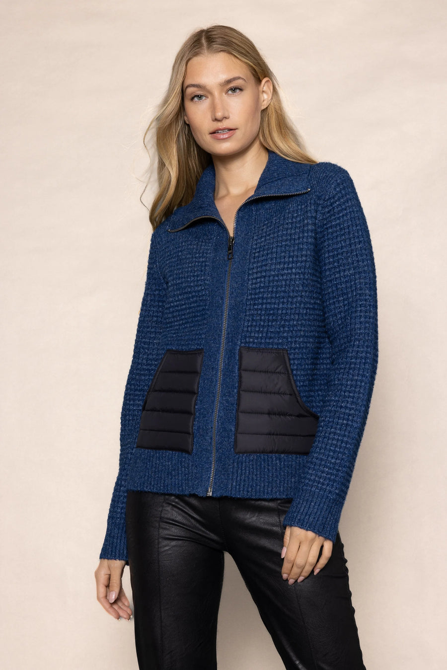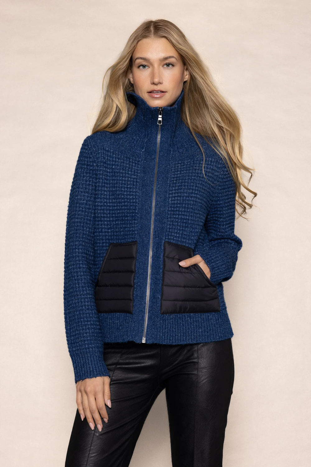 Indulge in luxury with Lisa Todd's Deep Pockets Sweater. This classic zip front jacket, made with a cotton wool blend, offers a relaxed fit and a textured stitch for a touch of sophistication. The added bonus of nylon puffer pockets make this sweater both stylish and practical.
