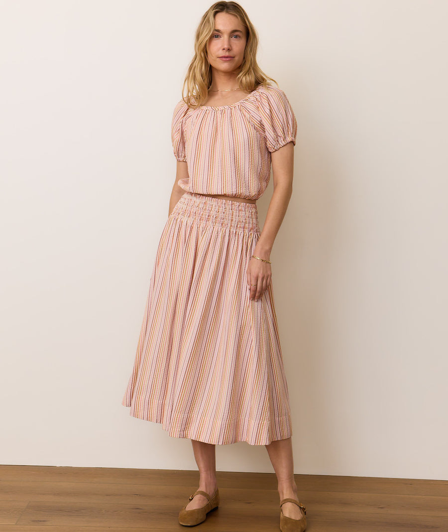 Get ready to turn heads in the Marine Layer Bea Seersucker Midi Skirt. This A-Line midi skirt features smocking at the waist, giving you the perfect fit every time. Breeze through your day in style with this playful and versatile skirt. (You'll be the envy of all your friends!)