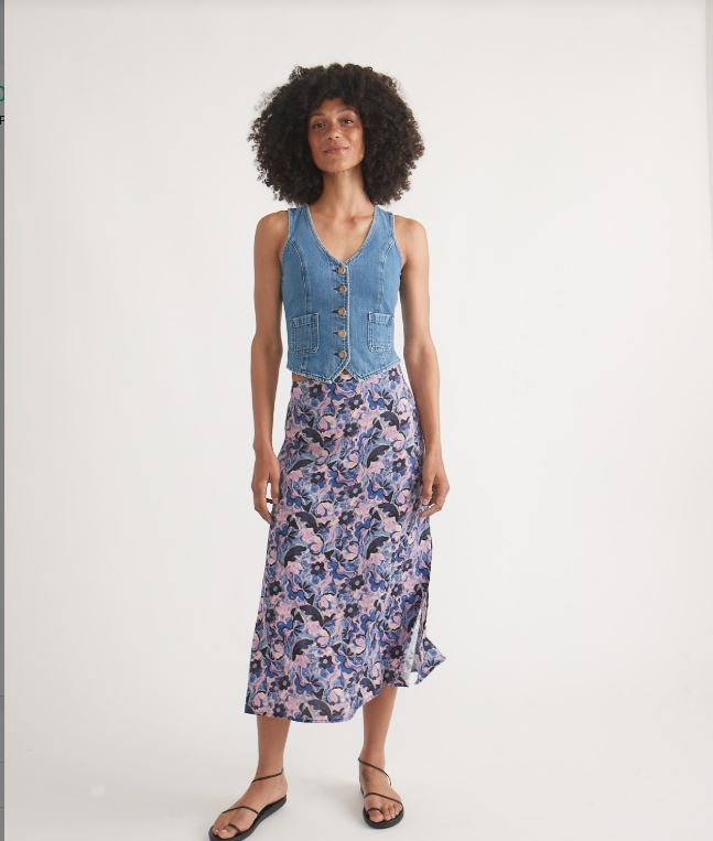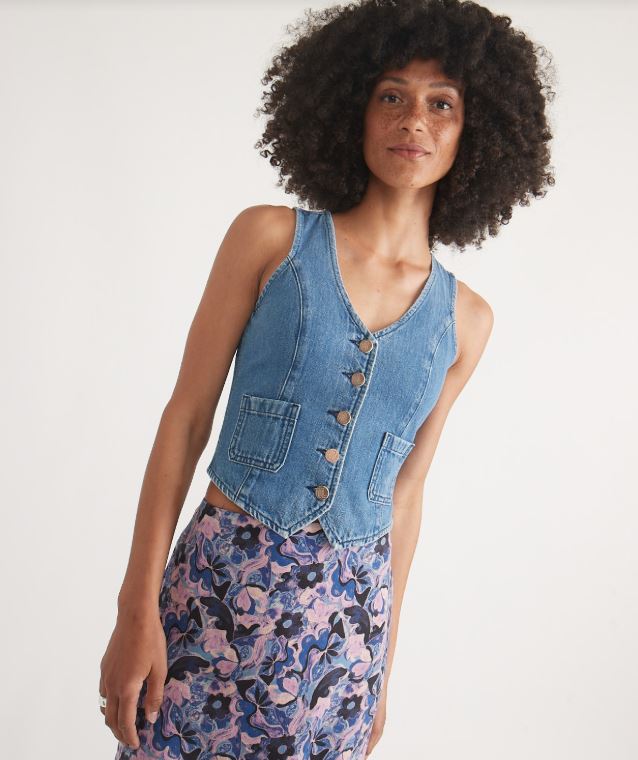 Introducing the Marine Layer Daisy Denim Vest, perfect for adding a touch of casual cool to any outfit. The medium blue wash denim gives a classic look, while the adjustable strap on the back allows for a customizable fit. Elevate your style and comfort with this versatile and stylish vest.