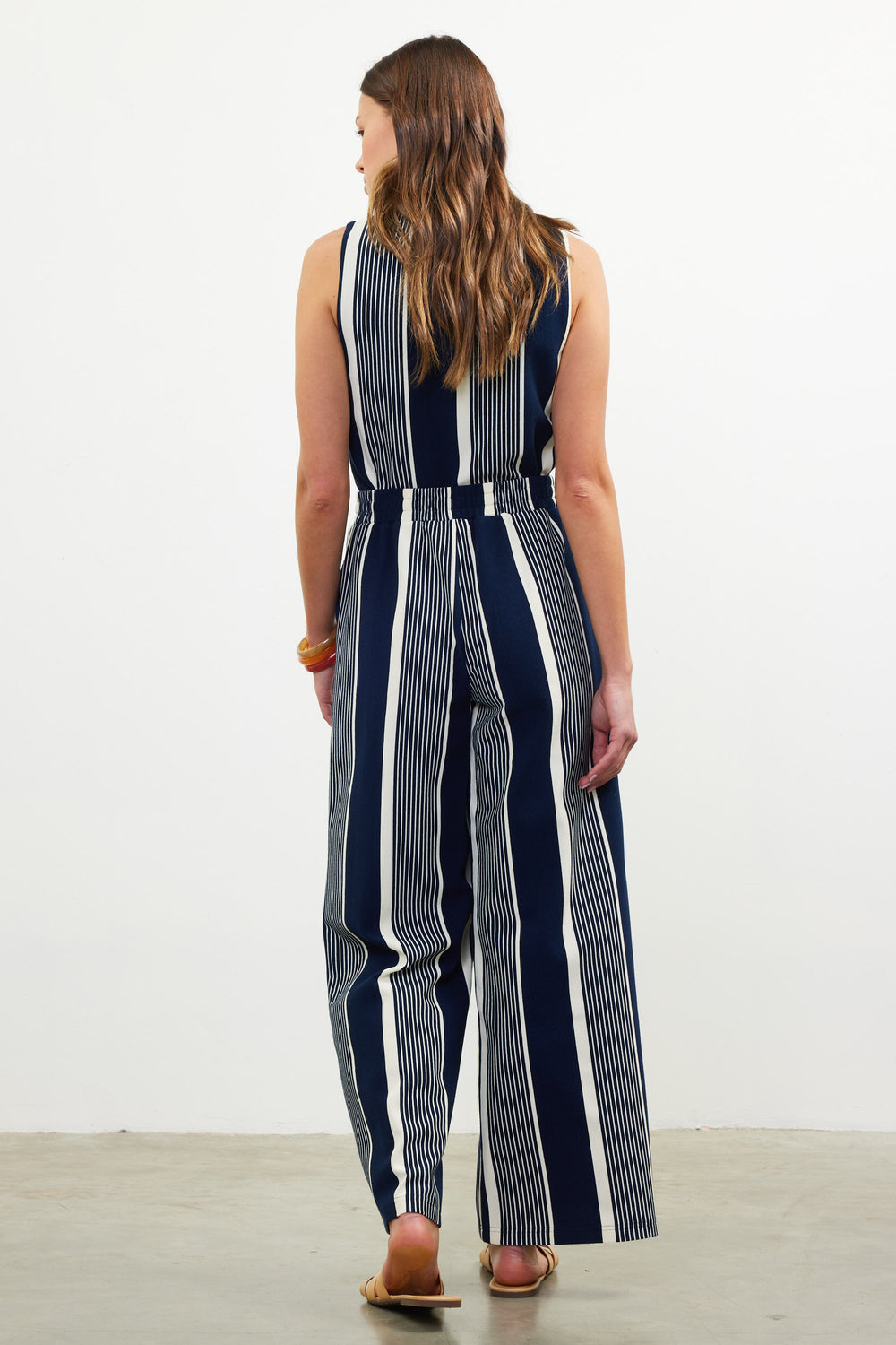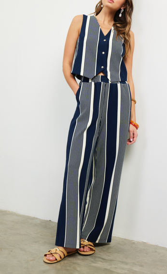 Take your wardrobe to new heights with these Skies Are Blue Variegated Stripe Knit Pants. These playful pants feature vertical stripes in a variety of widths, adding a touch of fun to any outfit. With a mix of navy and white knit, you'll feel stylish and comfortable all day long. Put your best leg forward with these quirky and unique pants!