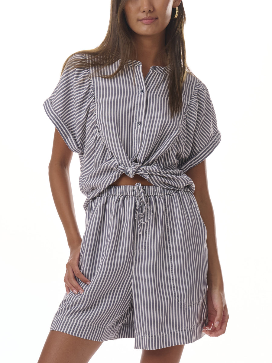 Stay cool and stylish with our Splendid Ella Stripe Short Sleeve Blouse. Made with 100% soft and sustainable Tencel fabric, this button down blouse is perfect for any occasion and will keep you feeling comfortable all day long. With a fun, playful design, this blouse is a must-have in your wardrobe.