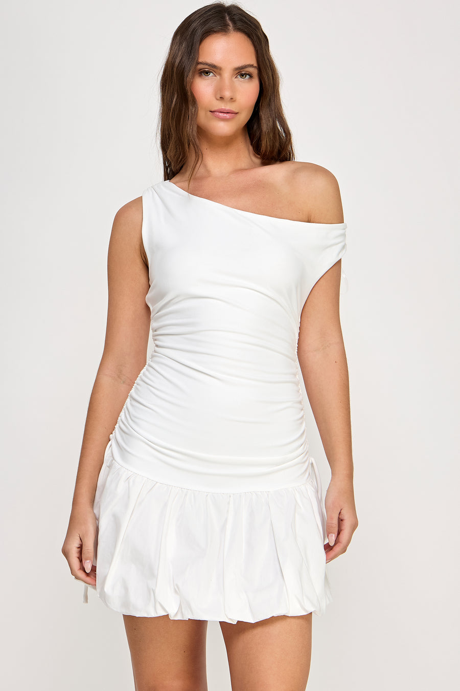 Get ready to dazzle in the Spring Haze Bubble Skirt Mini Dress. With its unique one off shoulder design and playful bubble skirt, this dress is perfect for making a statement. Made with a comfortable blend of polyester and spandex, it's the perfect combination of style and comfort.