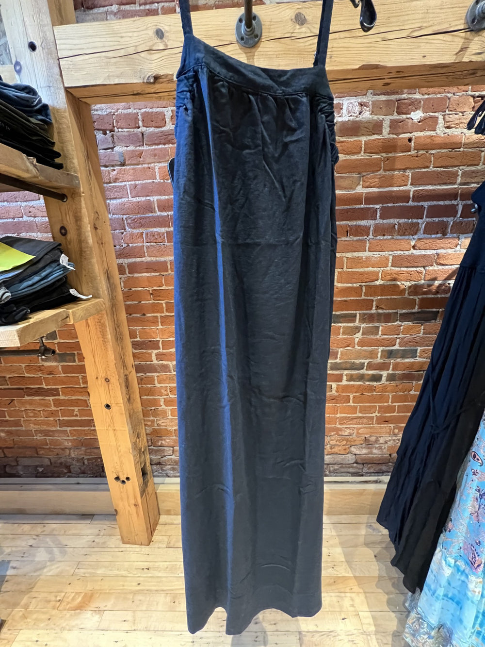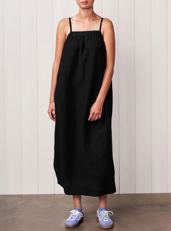 Elevate your wardrobe with the Stateside Linen A-line Maxi Dress, designed for effortless style and comfort. Featuring breathable linen fabric, this dress boasts flattering slits and convenient pockets on both sides. The delicate spaghetti straps and a thick band at the neck add a chic touch, making it perfect to wear alone or layered with a cozy sweater for versatile looks all year round. Embrace timeless elegance and practical design in one must-have piece.