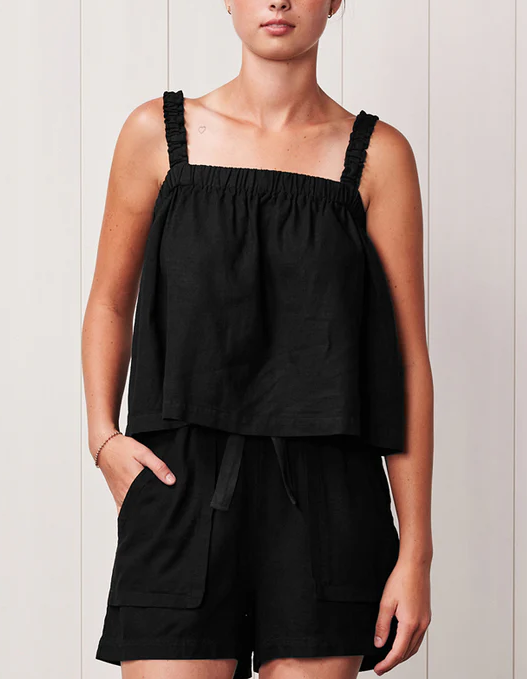 Experience effortless summer style with our Stateside Linen Ruched Shoulder Tank. Made from lightweight linen, this cropped tank features ruched shoulders for a unique and flattering look. Perfect for warm days, it will keep you cool and stylish all day long.