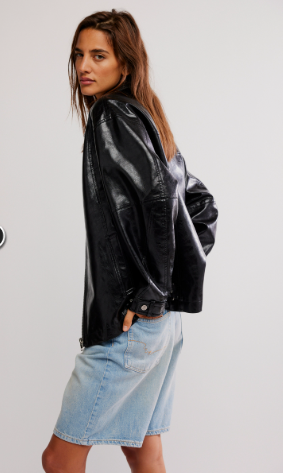 Turn heads with the Free People Sloane Vegan Jacket, crafted from sleek vegan leather that shines with every move. Its classic cut and playful dropped shoulders add a cool edge, while the collared neckline and zip-front closure keep things effortlessly stylish. Practical side pockets and a unique D-ring detail at the back complete this statement piece perfect for making your outfit pop.