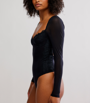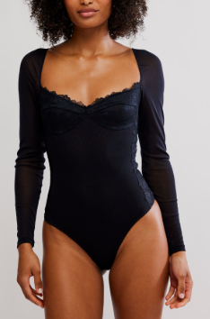 Elevate your style with the Free People Suddenly Fine Bodysuit, featuring delicate lace detail and scallop trim for a flirty touch. The sweetheart neckline and front bust cutout add a playful vibe, while cap-inspired sleeves and side slits keep things effortlessly chic. Finished with a back-hook closure and cutout, this bodysuit is perfect for turning heads day or night.