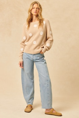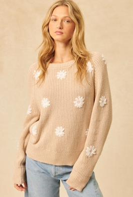 Wrap yourself in luxury with the John & Jenn Hendrix Sweater. Made from 100% cotton, this beautiful Sandstone sweater boasts a delicate knit design and charming daisy embellishments. Stay cozy and chic in this must-have crew neck, perfect for elevating any wardrobe.