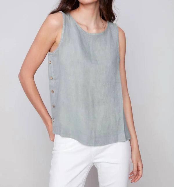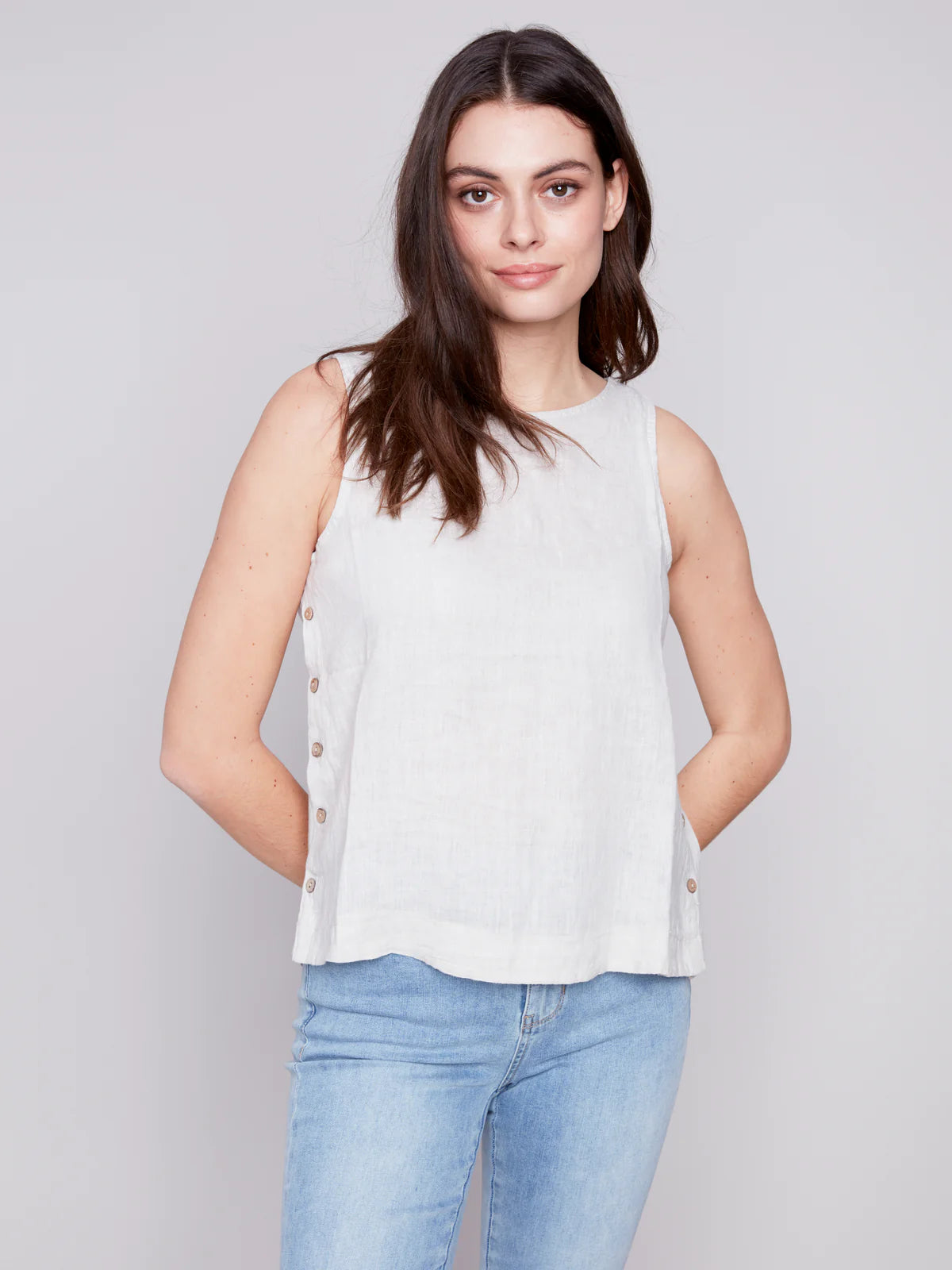 Soyez à votre meilleur avec le chemisier en lin sans manches à col rond et boutons latéraux Charlie B. Confectionné à partir de tissu 100% lin, ce chemisier présente une encolure ronde et des boutons latéraux pour un look à la fois raffiné et contemporain. Parfait pour toute occasion.