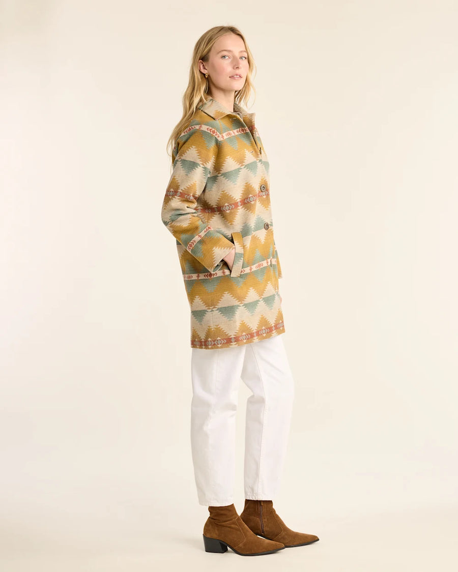 Stay cozy and stylish in the USA-made Pendleton Wool Mac Coat. Its Cape Creek jacquard design highlights vintage blanket-inspired prints, while the pure virgin wool fabric provides lightweight warmth. With a button-front closure, angled pockets, and a fully lined interior, this quirky coat is perfect for any adventure.