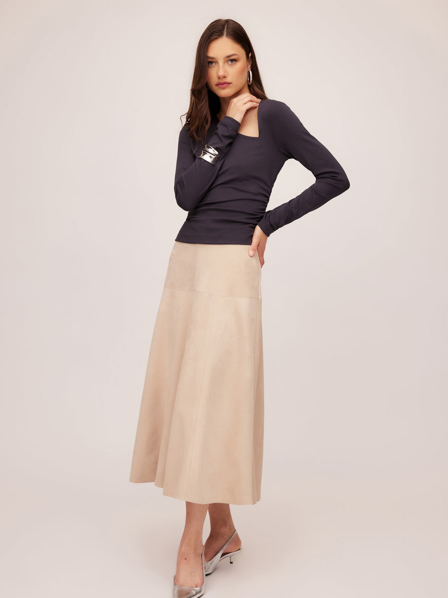 Turn heads with the Fifteen Twenty Blythe Faux Midi Skirt. Made with premium materials, this skirt offers comfort and style. Its midi length and faux leather texture add a touch of fun to any outfit. Perfect for a day out or a night on the town.