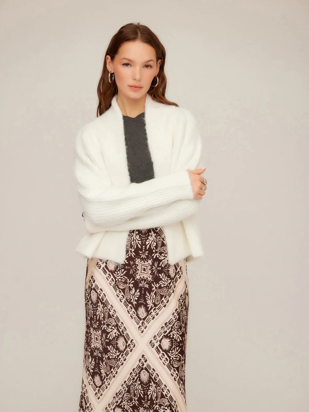 Experience cozy elegance with the Fifteen Twenty Cely Cropped Cardigan. Made from a plush, stretchy blend—featuring recycled fibers and a touch of wool—this cardigan offers a soft open front and long raglan sleeves for effortless comfort. Its clean, minimal silhouette and cropped length make it an ideal layering piece over dresses, knits, or high-waisted styles, elevating your outfit with sustainable style and versatility.