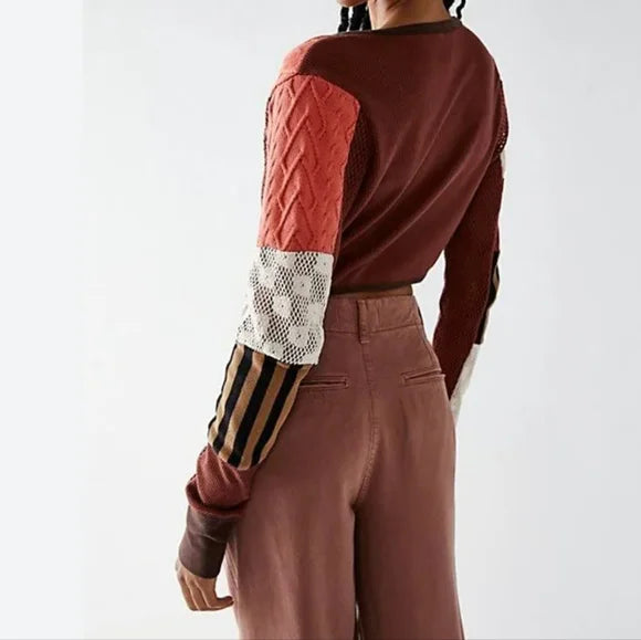 Wrap yourself in effortless style with this cropped knit top featuring a buttoned front design that ties together comfort and flair. Long sleeves provide coverage while mixed textures and playful prints add visual interest to your everyday wardrobe. Perfect for layering or wearing solo, this piece brings personality to any outfit with its unique, artistic vibe.