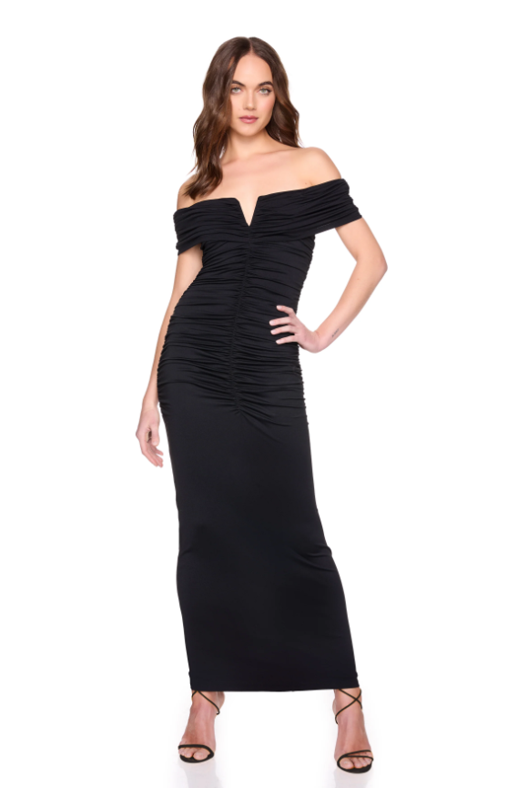 Elevate your style with the Susana Monaco V-Wire Gathered Off the Shoulder Dress. This floor-length dress features a flattering v-neckline and ruching from the neck to the hip. Perfect for any special occasion, this dress will make you feel confident and stylish.