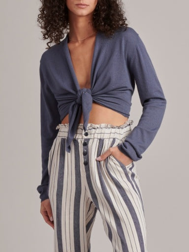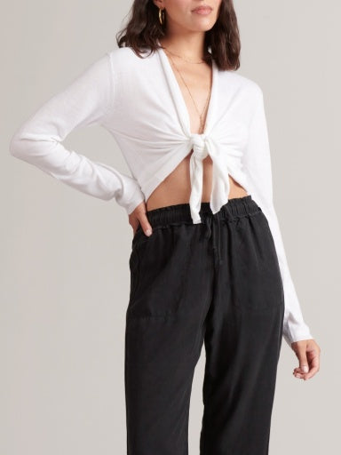 Le Splendid Sami Tie Cardigan est disponible en bleu marine cendré ou en blanc. Ce cardigan à manches longues noué sur le devant est un haut moulant.