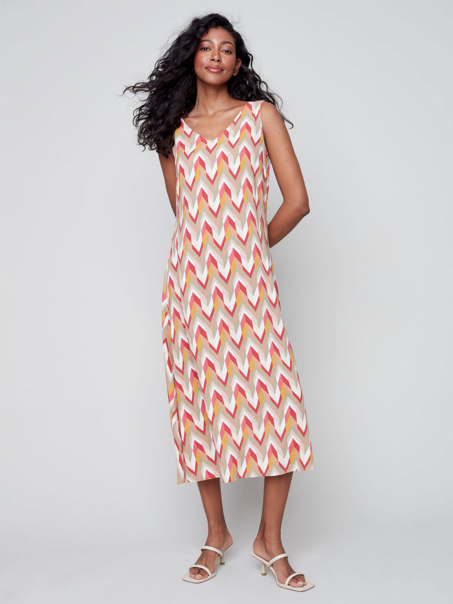 La robe longue à imprimé chevrons sans manches à col en V Charlie B est une robe élégante parfaite pour toutes les occasions. Il est confectionné dans un tissu léger et respirant pour un confort ultime. Le col en V et l'imprimé chevron créent un look élégant idéal par temps chaud. Portez cette robe intemporelle pour tout événement.