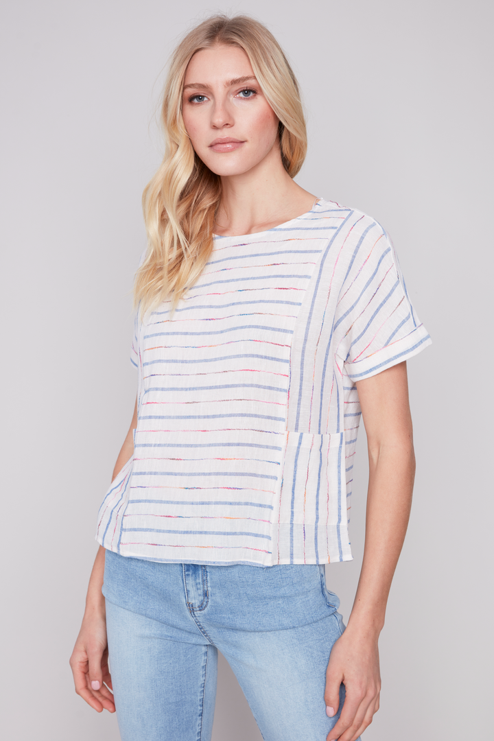 Add a touch of playfulness to your wardrobe with Charlie B's Yarn Dyed Embroidered Stripe Boxy Top! Featuring handy pockets and unique embroidered stripes, this top combines style and convenience. Perfect for those who don't take themselves too seriously.