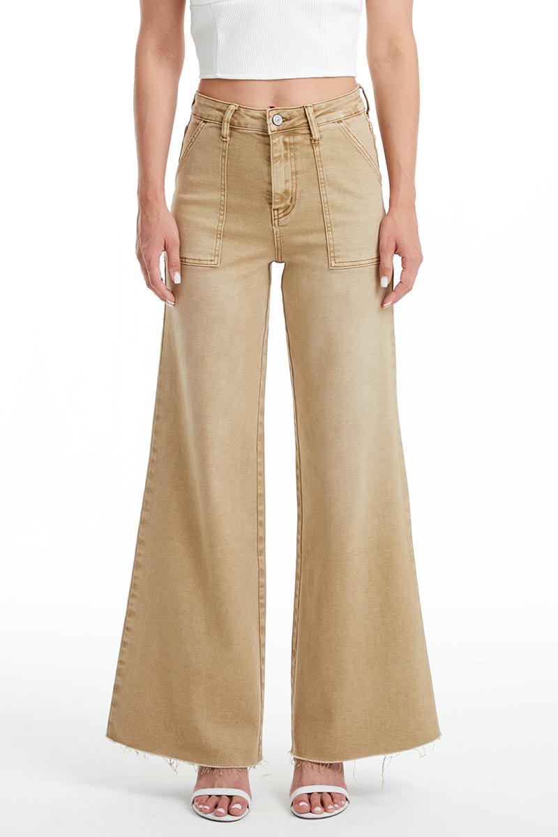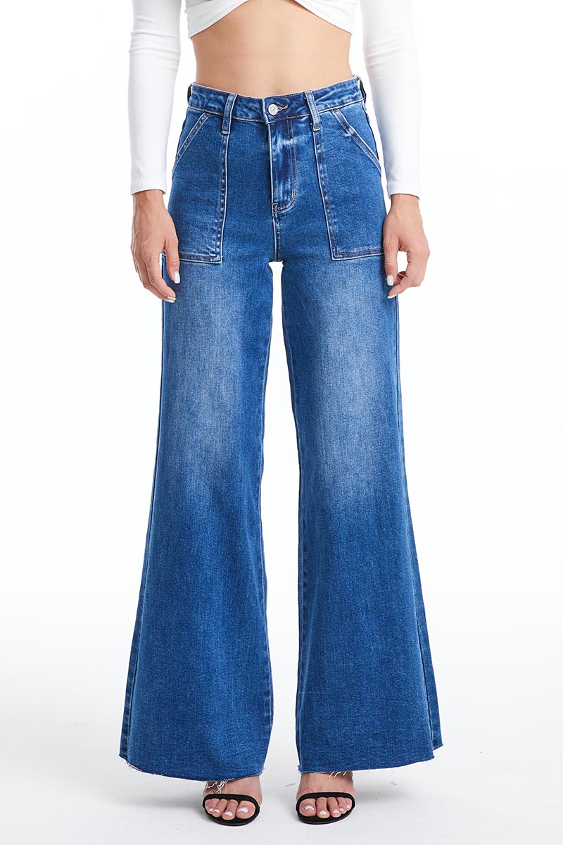 Experience superior comfort and style with Bayeas Utility Patch Pocket Wide Leg Jeans. Crafted from a durable fabric blend with touch of spandex, these jeans offer enhanced contour for a snug fit around the waist, hips, and legs. The high-rise design and unique utility patch pockets complete the sleek, modern look.