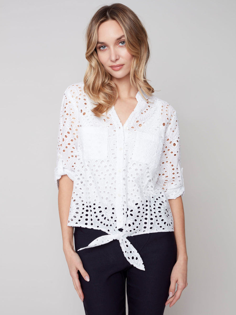 The Charlie B Long Sleeve Eyelet Button Down Front Tie Blouse is perfect for adding a sophisticated touch to any ensemble. Crafted from light and airy eyelet fabric, this blouse features a classic button down front and a delicate tie that accentuates the waist. An elegant addition to any wardrobe.