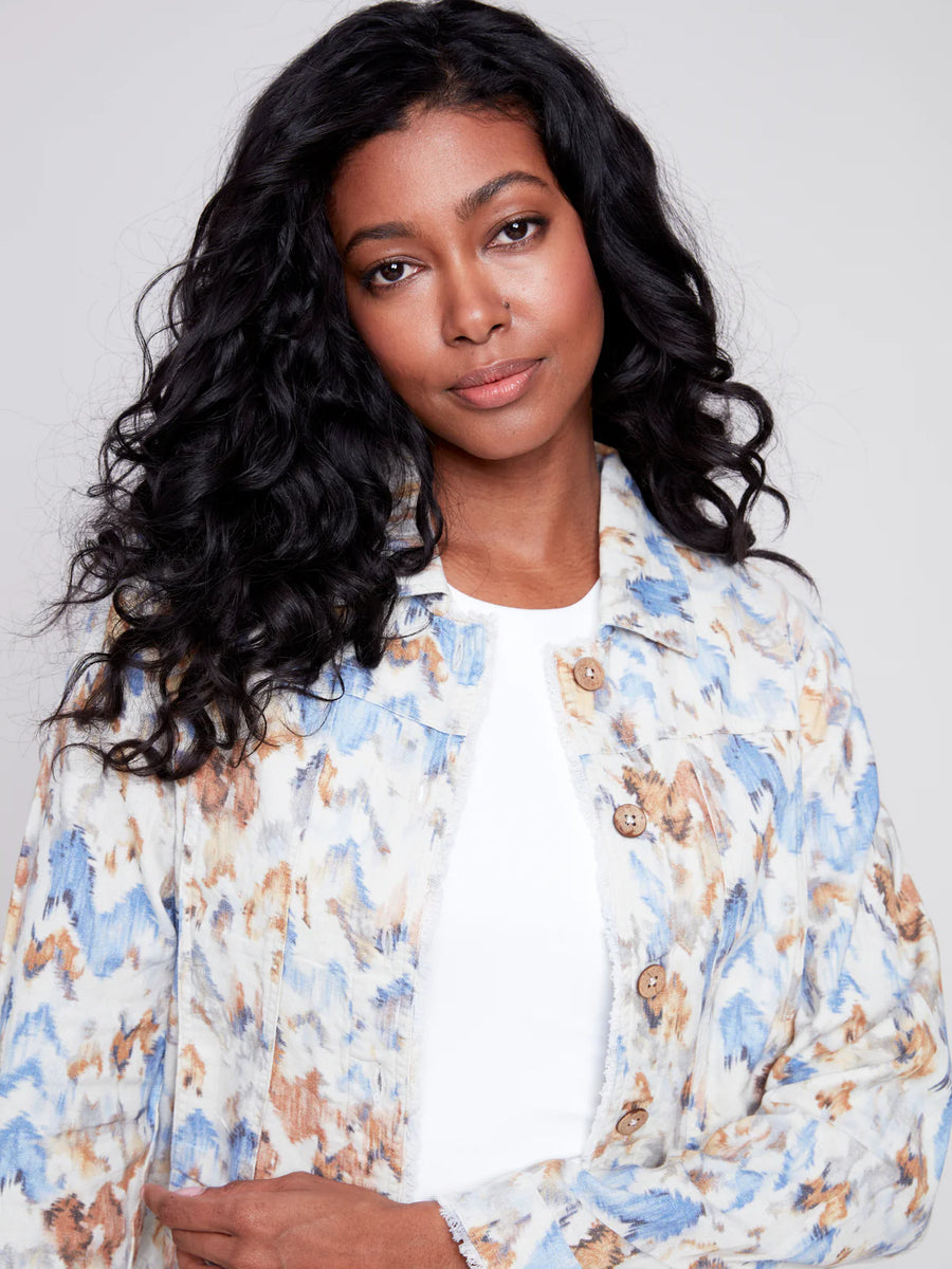 Expertly crafted from high-quality linen, the Charlie B Printed Long Sleeve Jacket offers timeless elegance and versatile style. With a flattering button-front design and long sleeves, this jacket effortlessly transitions from day to evening. Stay comfortable and chic with this must-have piece in your wardrobe.