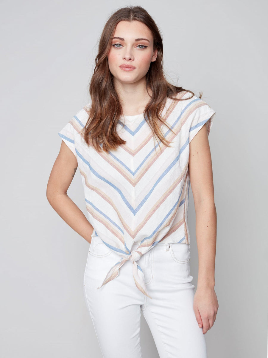 This Charlie B Striped Cap Sleeves Round Neck Front Tie Top is a stylish and versatile addition to any wardrobe. Featuring a round neckline, cap sleeves, and a front tie to adjust the fit, this top can be dressed up or down for any occasion. Its striped pattern adds a distinctive touch.