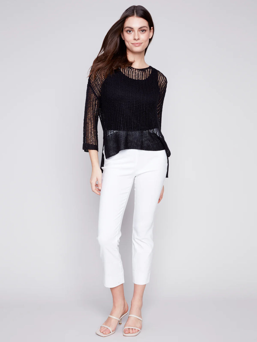 Charlie B V-Neck Fishnet Crochet 3/4 Sleeve Dolman Top